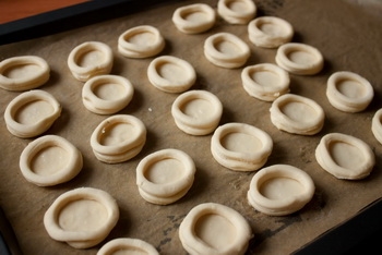 Виїмкою (склянкою) деаметром 4 см на нашому тесті робимо гуртки. Виїмкою меншого розміру ( діаметр 3-3 .5) вирізаємо з цих гуртків кільця. У яйця відокремити білок і трохи його збити міксером в зручній для вас посуді.