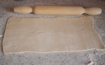 На дошці з допомогою качалки розкачуємо тісто в одному напрямку, злегка присипавши його борошном.