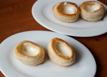 Розігріваємо нашу духовку до 200 градусів кладемо туди деко з заготовками для волованов і запікаємо. Воловоны повинні піднятися і зарум’яниться. На це вам буде потрібно близько 15 хвилин.