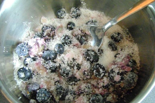 Для приготування соусу нам знадобиться чистий сотейник викласти ягоди. Я використовувала лохину. Потім посипаємо ягоди цукром і злегка розминаємо їх ложкою. Залишаємо постояти 10 хвилин.