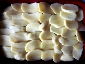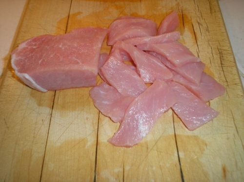 Беремо свинину і нарізаємо маленькими тонкими шматочками розміром приблизно по 2 див. Очищаємо цибулю й ріжемо невеликими півкільцями. Картоплю чистимо, нарізаємо тонкими кружечками.
