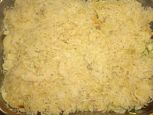 Беремо ємність, яку можна поставити в духовку, бажано високу сковороду. Змащуємо дно і краї рослинним маслом. Викладаємо м’ясо на дно, солимо, додаємо спеції. Зверху кладемо цибулю. Далі картопля розкладаємо так, щоб закрити всю поверхню. На картоплю наносимо майонез. Твердий сир натираємо на тертці, і розсипаємо його на картоплю.