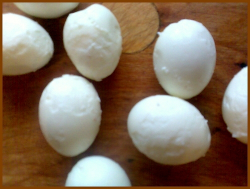 Зваріть яйця (хвилин 10-15) в солоній воді, поставте остигати в ходную воду. Потім чистимо їх і зрізаємо ножем гострий кінець, акуратно виймаємо жовток, при цьому не пошкоджуючи білка. Жовтки дрібно подрібнити. Зелену цибулю дрібно нашаткувати ножем, і растиреть (можна ложкою) з гірчицею і 1 столовою ложкою майонезу в тарілці, додати сіль за смаком, до утворення однорідної маси.