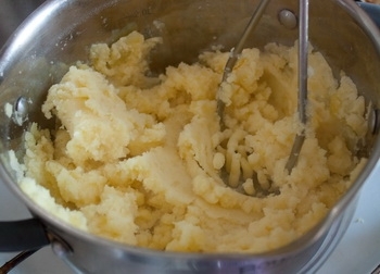 Для початку приготуємо картопляне пюре. Для цього картоплю почистимо, ретельно промиємо й наріжемо великими шматками. Заливаємо картоплю киплячою підсоленою водою, причому води за обсягом має бути набагато більше, ніж картоплі. Варимо до готовності, на це піде приблизно 20 хв, готовність можна перевірити ножем.