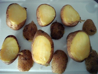 Тим часом, готова картопелька. Остуджуємо її і акуратно зрізаємо кришечки ось таким чином: