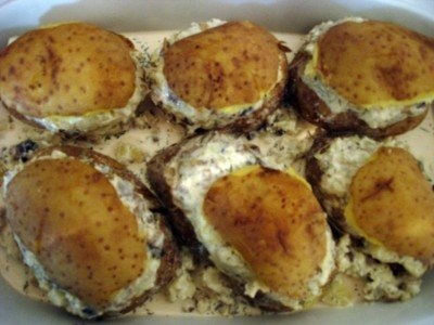 Сердечка картоплин подрібнюємо ножем,потім додаємо до них нашу,так би мовити,начинку і 3-4 ложки сметани. Трішки перчимо, солимо і ретельно перемішуємо. Наповнюємо кошики цієї густою сумішшю. Потім ми робимо заправку. Для неї нам знадобиться 200 мл. вершків змішати з 2 ст. ложками соєвого соусу, підсипаємо дрібку меленого мускатного горіха і трохи дрібнонарізаною зелені, змішуємо і поливаємо набиті начинкою картоплини. Це виглядає так: