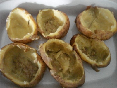 Потім ми обережно, не торопять, чайною ложечкою,виймаємо серцевину картоплини. Робимо це так,щоб не розламати оболонку навпіл.