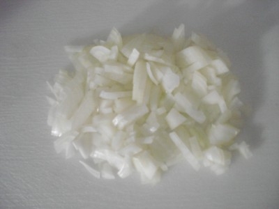 Поки будемо робити начинку, поставимо варитися картоплю для того, щоб не витрачати наш час. Для початку наріжемо цибулю кубиками і висипемо його на розігріту в рослинному маслі сковороду.