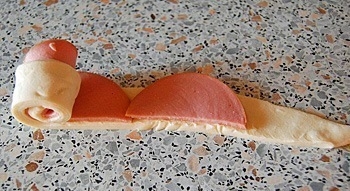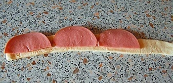 Так як тісто у нас покупне, місити його не доведеться. Ми беремо наш готовий продукт,розморожуємо і трохи розкачуємо.Після чого ріжемо на смужки близько 2см.Колбаску нарізаємо тоненькими скибочками і навпіл. Отримані полукружки викладемо так на смужку тіста, щоб залишився один вільний кінець тістовій смужки, інакше наші "буточики" будуть виглядати неповноцінними і неакуратними.