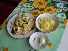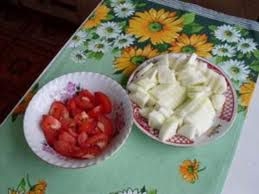 Кабачок і баклажан ріжемо невеликими шматочками,приблизно ,як це зробила я . Перець нарізаємо півкільцями. Цибулю і часник подрібнюємо на маленькі шматочки. Наші спеленькие помідори розрізаємо на чотири частини.