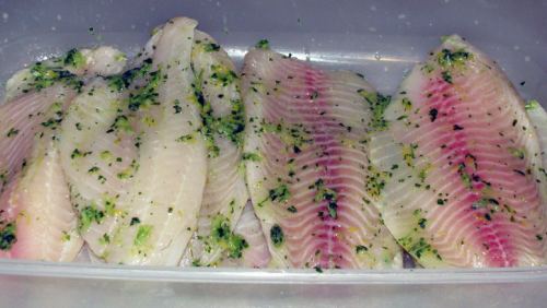 Таким маринадом обмазуємо з кожної сторони рибку. Навіть можна трошки втирати суміш. І тепер кладемо рибу в глибоку мисочку і обмотуємо харчовою плівкою або фольгою. Потім відправляємо в холодильник на півгодини. Після чого дістаємо і залишаємо ще на столі настоятися півгодини.