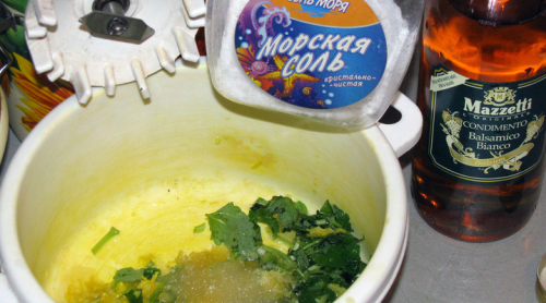 Потім закидаємо всі інгредієнти в окрему ємність і підкидає морської солі і оцту, в моєму випадку мазаретти. Після чого всю масу подрібнюють блендером до однорідності, щоб при змазуванні риби не було величезних шматочків.