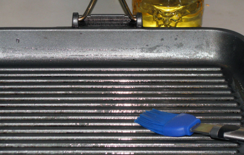 Обсмажувати рулетики ми будемо на сковороді-гриль. Для цього змащуємо її рослинним маслом і розігріваємо на середньому вогні.