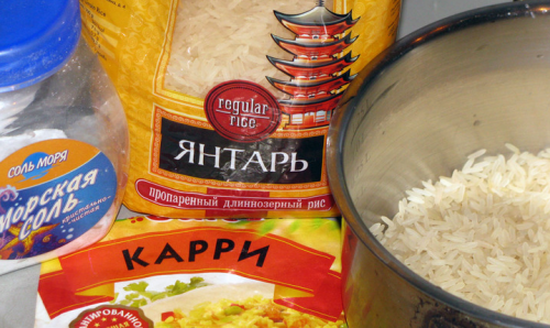 На гарнір до рибці відмінно підійде рис, який ми з Вами зараз приготуємо. Вибираємо рис і промиваємо водою. На одну частину рису має піти дві частини води. Спочатку потрібно поставити кипіти воду і трохи посолити. Як тільки вона починає вирувати, засипаємо в неї рис і приправляємо каррі. Потім накриваємо кришкою і залишаємо варитися на дрібному вогні 25-30 хвилин до готовності.