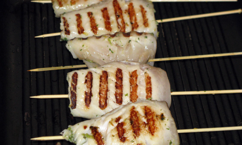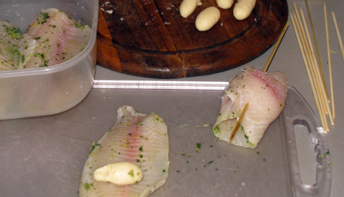 Начинкою для рибки у нас послужить плавлений сир. Ділимо його на дві частини і перетворюємо в яйцевидну форму,щоб легше було робити рулетик. Потім на внутрішню сторону риби кладемо сирні ковбаски, скачуючи їх в рулети. Після чого заколюємо шпажкою,щоб вони не відчепилися.