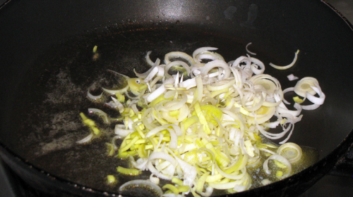 Для соусу обов’язково знадобиться цибулю-порей. Нарізаємо її тоненькими кільцями й обсмажуємо на соняшниковій олії, на середньому вогні до готовності.