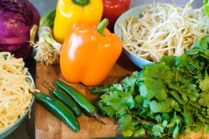Всі продукти промити. Помідори "Черрі" розрізати навпіл, перепелині яйця відварити і теж розрізати на 2 частини. Солодкий болгарський перець очистити від насіння і нарізати тонкою соломкою. Червоний цибулю і огірок нарізати кільцями.