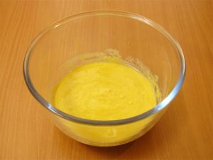 Робимо соус для салату. Візьміть миску для змішування інгредієнтів. Додайте 2 ч. ложки гірчиці і варені жовтки. Гарненько перемішайте, потім видавіть 2 часточки часнику, додайте лимонний сік, оцет, оливкова олія, сіль, перець і знову перемішайте до однорідної консистенції.
