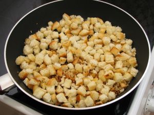 Сухарі можна купити в магазині, а можна приготувати і самим. Для цього необхідно в миску видавити 2 зубчики часнику і додати 6 ст. ложок оливкової олії, все добре переміщати і залишити на 10-15 хвилин. Поки масло настоюється батон наріжте невеликими акуратними кубиками. На розпечену сковороду вилийте настоявшееся масло і киньте обсмажуватися хліб. Перемішуючи, обсмажте сухарики до золотистого кольору.