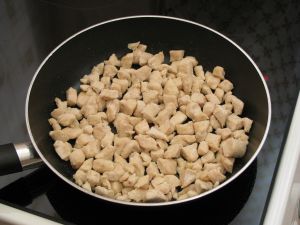 Курку нарізати невеликими шматочками і закинути на розпечену сковорідку. Поперчіть, посоліть і доведіть до готовності.
