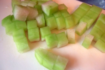 Кавунові скоринки очищаємо від рожевої м’якоті. Ножем зрізаємо з кірок тверду зелену шкірку. Нарізаємо кубиками 1х1 см, або при бажанні вирізаємо фігурки довільної форми.