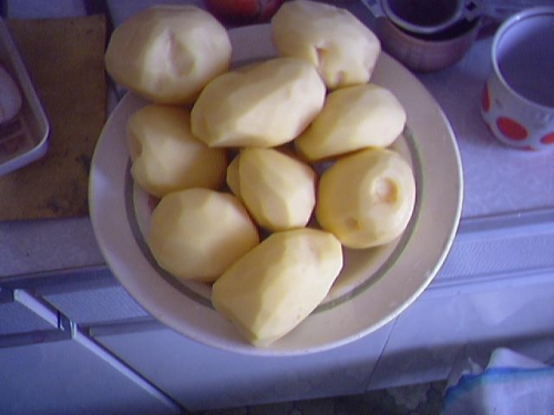 Визначтеся,скільки Ви б хотіли зробити шампурів,стільки і беріть картоплі. Я,наприклад,взяла 10 штук. Спочатку нам потрібно буде відварити картоплю в мундирі до напівготовності. Після того як він готовий,охолоджуємо його,щоб не обшпарити собі руки, і очищаємо від шкірки.