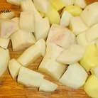Голови варяться дуже швидко, що Ви навіть і оком не моргнете. Тому, не відволікаючись, ми почистимо картоплю і наріжемо великими кубиками.