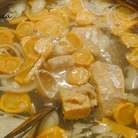 Далі ми виймаємо голови з бульйону, щоб вони не зварилися після повної готовності супу. Після чого додаємо картоплю, моркву і цибулю.