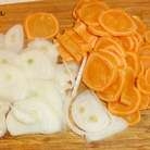 Потім очищаємо моркву і цибулю. Нарізаємо кільцями, незвично, правда? Хочеться за звичкою натерти на тертці або дрібно порубать.