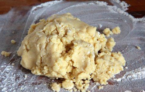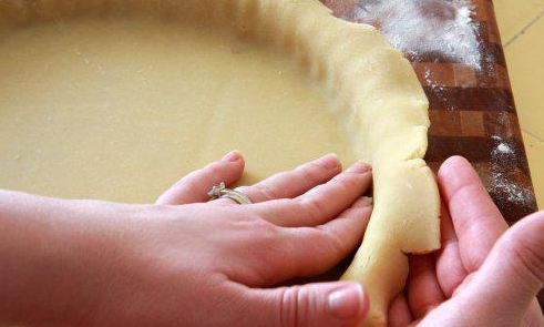 Лист пергаментного паперу посипаємо борошном. Дістаємо тісто з холодильника і викочуємо коло діаметром 30 сантиметрів. Потім помістимо тісто у форму і залишимо трохи висячими краю. Після чого візьмемо виделку і обколем нею центр кола,щоб коли тісто випікалося не утворилися опуклості. А потім відправляємо його ще на 10 хвилин заморозитися.