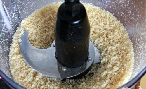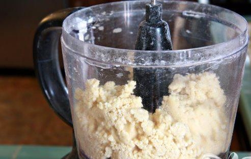 Робити мигдалеву начинку дуже легко. Для цього візьмемо блендер і закинем в нього борошно і мигдаль. І все це подрібнюємо. Потім додаємо 7 столових ложок цукру, масло і яйце, включаємо знову блендер і збиваємо до однорідності. Після чого вилажіваем начинку в окрему мисочку і ставимо в холодильник мінімум на три години.