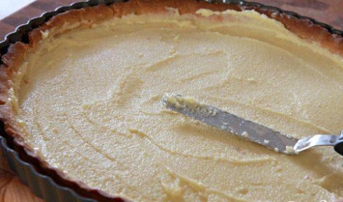 Як тільки корж готовий,даємо йому трохи охолонути і потім покриємо його мигдальною начинкою.