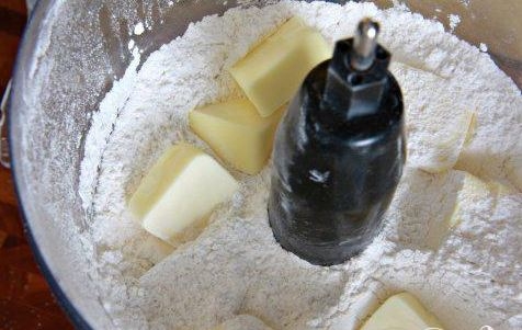 Тісто ми теж будемо робити в блендері,тому не відкладайте його далеко. Закидаємо борошно, нарізане шматочками вершкове масло і сіль. Після чого перемішуємо 5 разів,щоб все добре перемішалося.