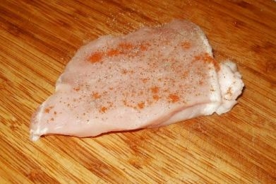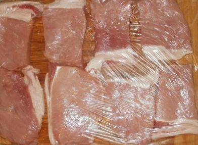 Зробимо кишеньки з м’яса. Візьмемо свинину і промиємо її водою, після чого нарізаємо шніцелями в 1.5-2 сантиметра. Зверніть увагу ,щоб шматки м’яса здавалися товстими,тому що ми їх потім наріжемо надвоє. Потім шматочки м’яса накриваємо плівкою і трохи відбиваємо,робимо це акуратно ,щоб не пошкодити поверхню.