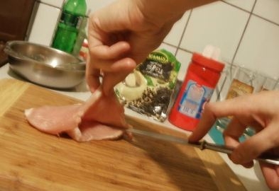 Тепер прорізаємо середину шніцеля ножем, роблячи йому кишеньку.