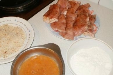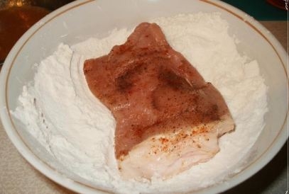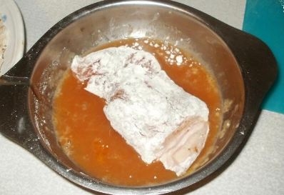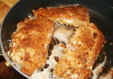 У сковроду наливаємо масло і ставимо розігрітися на плиту. Потім кожен шматочок заправленого м’яса опускаємо спочатку в борошно, потім в яйце і наостанок в сухарі. Цією дією шкурочка вийде дуже ніжна.
