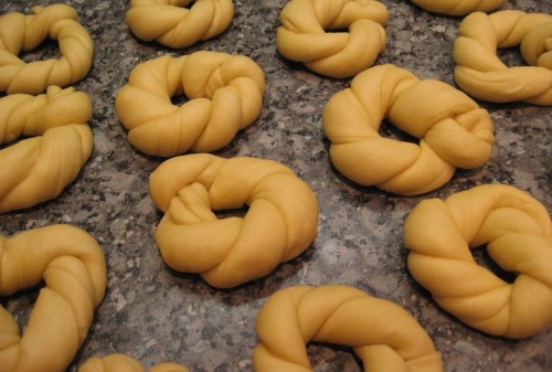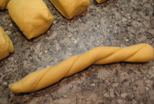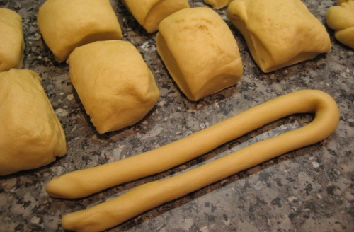 Кожен кружечок розгортаємо в ковбаску і складаємо навпіл. Після чого перекручуємо жгутиком, наступним дією формуємо бублик.
